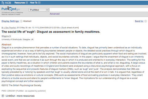 The social life of 'eugh': Disgust as assessment in family mealtimes. "Disgust is a complex phenomenon that pervades a number of social situations. To date, disgust has primarily been understood as an individually experienced emotion or as a way of defining boundaries between people or objects; the detailed social practices through which disgust is choreographed, however, have yet to be fully explored. The social implications of disgust are particularly apparent when food and eating are involved, as it is in such settings that individuals, objects, and social boundaries coincide. In this paper, I argue that the enactment of disgust is an inherently social event, and that we can evidence it as such through the way in which it is produced and oriented to in everyday interaction. The setting for this paper is family mealtimes, as a situation in which children and parents explore the boundaries of what is, and what is not, disgusting. A large corpus of video and audio recordings of mealtimes in England and Scotland were analysed using a discursive psychological approach, with a focus on explicating the sequential and prosodic features of disgust markers (DMs), such as 'eugh' and 'yuck'. The analysis demonstrates that DMs are typically preceded by a 'noticing' by speakers and that 'eugh' is usually uttered alone and at the start of a turn in talk. It is argued that, regardless of their putative status as emotions or cultural concepts, DMs work as assessments of food and eating practices in everyday interaction. They orient others to a trouble source and attend to people's entitlements to 'know' disgust. The implications for our understanding of disgust as a social psychological concept are further explored."