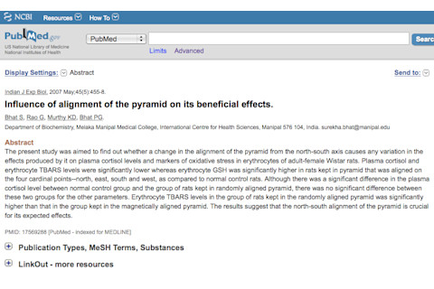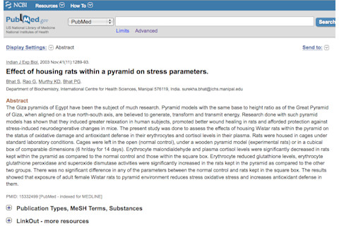 Effect of housing rats within a pyramid on stress parameters. "The Giza pyramids of Egypt have been the subject of much research. Pyramid models with the same base to height ratio as of the Great Pyramid of Giza, when aligned on a true north-south axis, are believed to generate, transform and transmit energy. Research done with such pyramid models has shown that they induced greater relaxation in human subjects, promoted better wound healing in rats and afforded protection against stress-induced neurodegnerative changes in mice. The present study was done to assess the effects of housing Wistar rats within the pyramid on the status of oxidative damage and antioxidant defense in their erythrocytes and cortisol levels in their plasma. Rats were housed in cages under standard laboratory conditions. Cages were left in the open (normal control), under a wooden pyramid model (experimental rats) or in a cubical box of comparable dimensions (6 hr/day for 14 days). Erythrocyte malondialdehyde and plasma cortisol levels were significantly decreased in rats kept within the pyramid as compared to the normal control and those within the square box. Erythrocyte reduced glutathione levels, erythrocyte glutathione peroxidase and superoxide dismutase activities were significantly increased in the rats kept in the pyramid as compared to the other two groups. There was no significant difference in any of the parameters between the normal control and rats kept in the square box. The results showed that exposure of adult female Wistar rats to pyramid environment reduces stress oxidative stress and increases antioxidant defense in them."