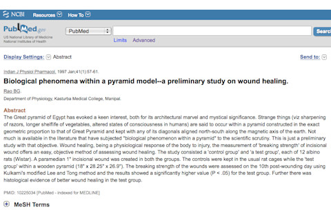 Biological phenomena within a pyramid model--a preliminary study on wound healing. "The Great pyramid of Egypt has evoked a keen interest, both for its architectural marvel and mystical significance. Strange things (viz sharpening of razors, longer shelflife of vegetables, altered states of consciousness in humans) are said to occur within a pyramid constructed in the exact geometric proportion to that of Great Pyramid and kept with any of its diagonals aligned north-south along the magnetic axis of the earth. Not much is available in the literature that have subjected "biological phenomenon within a pyramid" to the scientific scrutiny. This is just a preliminary study with that objective. Wound healing, being a physiological response of the body to injury, the measurement of 'breaking strength' of incisional wound offers an easy, objective method of assessing wound healing. The study consisted a 'control group' and 'a test group', each of 12 albino rats (Wistar). A paramedian 1" incisional wound was created in both the groups. The controls were kept in the usual rat cages while the 'test group' within a wooden pyramid (18" x 28.25" x 26.9"). The breaking strength of the wounds were assessed on the 10th post-wounding day using Kulkarni's modified Lee and Tong method and the results showed a significantly higher value (P < .05) for the test group. Further there was histological evidence of better wound healing in the test group."