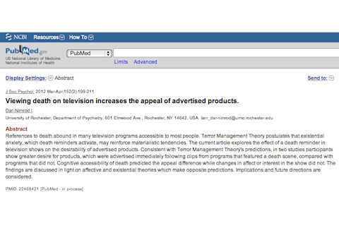 "References to death abound in many television programs accessible to most people. Terror Management Theory postulates that existential anxiety, which death reminders activate, may reinforce materialistic tendencies. The current article explores the effect of a death reminder in television shows on the desirability of advertised products. Consistent with Terror Management Theory's predictions, in two studies participants show greater desire for products, which were advertised immediately following clips from programs that featured a death scene, compared with programs that did not. Cognitive accessibility of death predicted the appeal difference while changes in affect or interest in the show did not. The findings are discussed in light on affective and existential theories which make opposite predictions. Implications and future directions are considered."