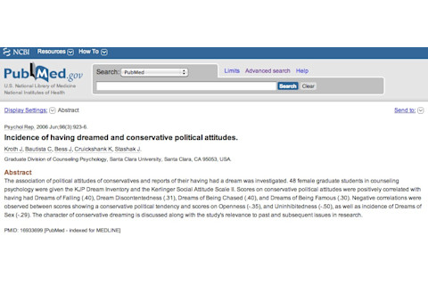 "The association of political attitudes of conservatives and reports of their having had a dream was investigated. 48 female graduate students in counseling psychology were given the KJP Dream Inventory and the Kerlinger Social Attitude Scale II. Scores on conservative political attitudes were positively correlated with having had Dreams of Falling (.40), Dream Discontentedness (.31), Dreams of Being Chased (.40), and Dreams of Being Famous (.30). Negative correlations were observed between scores showing a conservative political tendency and scores on Openness (-.35), and Uninhibitedness (-.50), as well as incidence of Dreams of Sex (-.29). The character of conservative dreaming is discussed along with the study's relevance to past and subsequent issues in research."