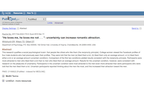 He loves me, he loves me not . . . ": uncertainty can increase romantic attraction. "This research qualifies a social psychological truism: that people like others who like them (the reciprocity principle). College women viewed the Facebook profiles of four male students who had previously seen their profiles. They were told that the men (a) liked them a lot, (b) liked them only an average amount, or (c) liked them either a lot or an average amount (uncertain condition). Comparison of the first two conditions yielded results consistent with the reciprocity principle. Participants were more attracted to men who liked them a lot than to men who liked them an average amount. Results for the uncertain condition, however, were consistent with research on the pleasures of uncertainty. Participants in the uncertain condition were most attracted to the men-even more attracted than were participants who were told that the men liked them a lot. Uncertain participants reported thinking about the men the most, and this increased their attraction toward the men."