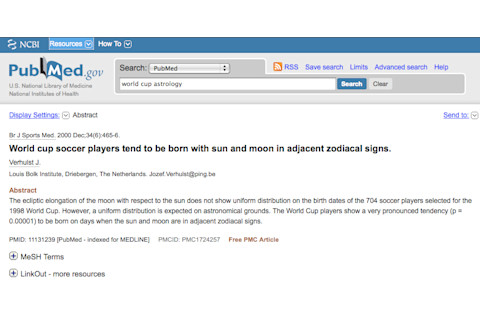 World cup soccer players tend to be born with sun and moon in adjacent zodiacal signs. "The ecliptic elongation of the moon with respect to the sun does not show uniform distribution on the birth dates of the 704 soccer players selected for the 1998 World Cup. However, a uniform distribution is expected on astronomical grounds. The World Cup players show a very pronounced tendency (p = 0.00001) to be born on days when the sun and moon are in adjacent zodiacal signs."