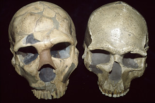 Replicas of the La Ferrassie 1 (Neanderthal) and Predmosti 3 (early modern) skulls. Image courtesy of The Natural History Museum London. The brains of Neanderthals were about the same size as those of humans, but they were not organized the same way. In a study published yesterday, researchers at Oxford show that much of the Neanderthal brain was dedicated to vision and movement instead of the higher order thinking characteristic of the human brain. They say this limited brain capacity could also explain Neanderthals' eventual demise. The researchers compared Neanderthal fossils with the skeletons of ancient but anatomically modern humans. To get an idea of how much actual brain tissue once filled these skulls, the researchers calculated the ratio of brain to body size for the skeletons and compared them with the brain/body size ratios of living primates. They found that Neanderthals dedicated a larger portion of their brain to controlling their movements than did modern humans, probably because of their larger body size. Likewise, limited daylight in Eurasia's northern latitudes forced Neanderthals to evolve bigger eyes in order to process the light, compared to the smaller eyes of humans with origins in sunny Africa. The portion of the Neanderthal brain dedicated to vision is larger as a result, according to the results published Tuesday in Proceedings of the Royal Society B. Since Neanderthals used a greater proportion of their brain for basic motion and vision control, they didn't have as much brain capacity left to innovate. For example, they had smaller parietal lobes, which humans use for navigation and language skills. When the Ice Age rolled around, Neanderthals couldn't create complex societies or trade networks to overcome resource scarcities, which scientists think ultimately did them in.