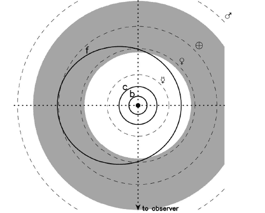 There's some chatter on the web right now over a new scientific paper about a nearby exoplanet, and what I'm seeing are people speculating that it might be earth-like. Technology Review even titled their article "Astronomers Discover Habitable ExoEarth Orbiting Binary Star". The problem with that is that the planet's not terribly earth-like, and it may not be habitable*. So what's the deal? I read the journal article (PDF), and this really is a good story, just not the one I'm seeing the chatter about. 55 Cancri is a nearby binary star at a distance of about 40 light years. One star is a dinky red dwarf, and the other is a fairly Sun-like star, though somewhat smaller and cooler. It's also much older, roughly 10 billion years old, more than twice the age of the Sun. It's actually at the point where it's starting to evolve into a red giant, and is called a sub-giant. Back in 2007 it was announced that at least five planets orbit the bigger of the two stars (called 55 Cancri A; confusingly the red dwarf is 55 Cancri B (note the capital letter), while the planets are called b-f (lower case)). They range in mass from 0.026 to 3.84 times that of Jupiter (8.3 to 1200 times the mass of the Earth). 55 Cancri e is the lowest mass of these, but is extremely dense and hot, so not at all earth-like. 55 Cancri f is the interesting planet, though. The astronomers in question observed the star using an interferometer, allowing extremely precise measurements of the star's size, which in turn yielded very accurate numbers for its temperature and mass. All these together can be used to figure out its "habitable zone", the region around it where an orbiting planet would have liquid water on its surface. Now right away, I'll say that finding the HZ (as we in the know call it) is not really straightforward. For example, a planet that has a thick atmosphere can be farther from its star and still have water due to the greenhouse effect; in fact, without air the average surface temperature of the Earth would be below freezing! And the greenhouse effect depends on what's in the atmosphere, its density, and so on. So I am wary of any declarations of planets being habitable based on this alone. Still, let's see what we get. The authors published this diagram of the orbit of planet f: