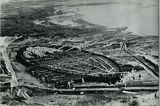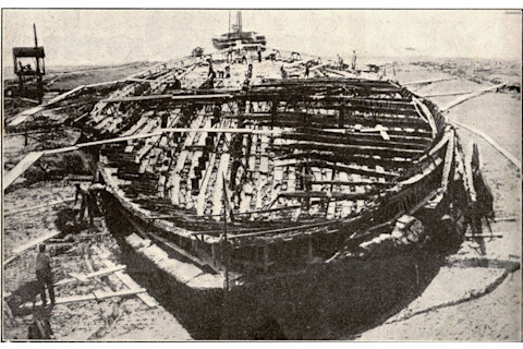 It was only a matter of time, then, before the dictator’s attention turned to the mysterious ships at the bottom of Lake Nemi. In 1929, Mussolini ordered something unprecedented. The whole of Lake Nemi would be drained. Engineers reactivated an ancient Roman cistern that together with a modern pump reduced the lake’s water level by 65 feet. In the mud, slowly emerging from the waters, the Italian engineers found not one, but two enormous shipwrecks. The excavations would take years, with the second ship not brought up until 1932.