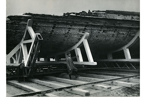 A man poses with one of the Nemi ships. (Credit: Archivio fotografico storico del Museo della scienza e della tecnologia L. da Vinci/Wikimedia Commons)