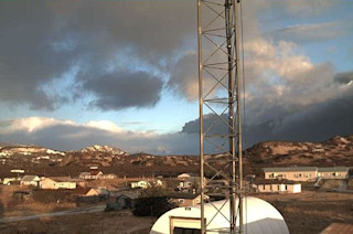 Overnight, Alaska’s Veniaminof had its first eruption in a little over a year. An eruption plume reached 4.5 kilometers (15,000 feet) up and the plume was tracked spreading southeast for over 150 kilometers (90 miles). Visibility is low in the area of the Alaska Peninsula where Veniaminof is located, but the Perryville FAA webcam caught a glimpse of the dark grey ash plume (see above) this morning (Alaska time). The Alaska Volcano Observatory raised the alert status to Red after this new eruption started.