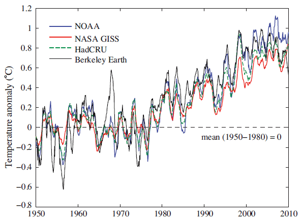 This plot shows what's called the temperature anomaly, the change in temperature from some average value. In this case, they took the values from 1950 to 1980 and used that as a baseline -- this is pretty standard practice in climate studies. Four different studies are plotted, including the BEP results in black. As you can see, all of them show a big rise, and the BEP results agree closely with (or are even greater than) the results from NASA's Goddard Institute for Space Studies. Scientists at NASA/GISS were attacked heavily during "climategate"