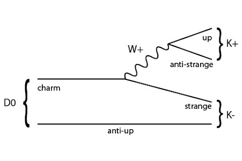 Let's look at the D0 meson. What happens is the charm quark (much heavier than the anti-up) decays into three lighter quarks: either up + strange + anti-strange, or up + down + anti-down. If it's the former, we get a K- and a K+; if it's the latter, we get a π- and a π+. Here's one example, where D0 goes to K- and K+.