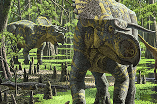 Nasutoceratops titusi in its forest environment of the Kaiparowits Formation. By Raúl Martín Paleontologists in Utah have not only discovered a new species of dinosaur; the recently described skull actually represents an entirely new genus with an unusually large nose and long, front-facing horns. During the late Cretaceous period, an elevated sea level split North America in two. The western landmass was called Laramidia and included what is now the west coast of Canada and the United States. This swampy region was filled with all kinds of dinosaurs. In fact, it was the greatest documented radiation of dinosaurs anywhere during the entire Mesozoic era. (Also known as the Age of Reptiles, this era refers to all of the Triassic, Jurassic and Cretaceous periods put together.) During this time, the ceratopsidae family had the greatest number of species, including the triceratops. These related species were notable for their unique nose horns and head frills. Researchers think these boney features were partly for fighting and partly for nonverbal communication (recognizing members of their own species or competing for mates). The ceratopsidae family evolved quickly to produce the most diverse family tree of any dinosaur in Laramidia.