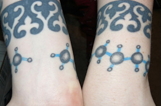 Lisa writes, "These are simple hydrocarbon chains (nonane, to be exact)-- one on each wrist. They end on the bottom sides of my wrists. I am a synthetic organometallic chemistry PhD student at the University of Washington, and I got these linear hydrocarbon 'bracelets' as I transitioned into my undergrad chemistry program. When I get my PhD, I want to get a tattoo of the first crystal structure I published (of my first unique molecule synthesized)!"