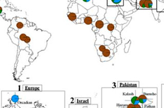 The map to the right shows the frequencies of HGDP populations on SLC45A2, which is a locus that has been implicated in skin color variation in humans. It's for the SNP rs16891982, and I yanked the figure from IrisPlex: A sensitive DNA tool for accurate prediction of blue and brown eye colour in the absence of ancestry information. Brown represents the genotype CC, green CG, and blue, GG. Europeans who have olive skin often carry the minor allele, C. While SLC24A5 is really bad at distinguishing West Eurasians from each other, SLC45A2 is better. Though both are fixed in Northern Europe, the former stays operationally fixed in frequency outside of Europe, in the Near East. As I stated earlier the proportions of the ancestral SNP in the Middle Eastern populations in the HGDP seem to be easily explained by the Sub-Saharan admixture you can find in these groups.