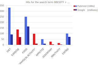 But have we forgotten that? Do we talk about the diet side of the equation more? I ran a few searches on PubMed and Google for “obesity” + various other terms to try and find out and it looks like Whyte is right.