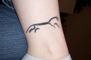 "My latest tattoo is a black-line representation of the Uffington White Horse in England. It's a huge earthwork carved into the countryside about three thousand years ago. I'm not really sure what compelled me to get it, since I'm a grad student in English and not archaeology or anthropology. But it's such a beautiful, simple design, and it represents a real feat of Bronze Age ingenuity."