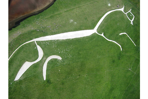 Carl: There was a time when the Uffington Horse was thought to be a dragon--in particular, the dragon slain by St. George. But in fact, it is older than dragons. The Uffington Horse is three thousand years old, we now know, because that is the last time that light struck the buried soil around the figure. Some kinds of soil and sand contain radioactive elements that break down at regular intervals. The energy they release damages the crystal structure of the soil particles, creating traps in which electrons get stuck. Sunlight striking the soil has enough energy to jostle the electrons free, and they release a tiny burst of energy. Once this soil gets buried, however, the electrons become trapped again, and the longer it is buried, the more electrons are trapped. Scientists dug up buried soil around the Uffington Horse and shined a light on it. Electrons incarcerated for three thousand years escaped, and in a flash, the horse had an age. Click here to go to the full Science Tattoo Emporium.