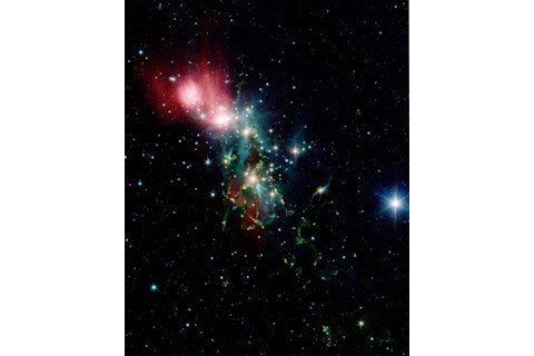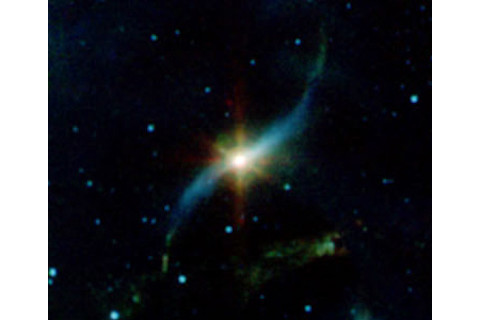 OK, first, wow. That's a very pretty picture (click it for access to a vastly bigger copy). But what is it? It won't really help you much if I tell you that it's named NGC 1333 (the 1333^rd object in the New General Catalog of celestial objects, which was published in 1877, making it not terribly new anymore), but it might help more if I say that it's a region of gas, dust, and hot young stars (that phrase should up my Google ranking!) in the constellation of Perseus. It's about 1000 light years away, give or take. I've seen manyimagesof it, but none quite like this. Why not? Because this one is in infrared. Regular readers (both those who eat their bran and otherwise) know that looking in the infrared can tell you a lot more about an object than visible light alone can. In this case, infrared light is useful because it can travel through dust that would otherwise block the visible light. NGC 1333 is a beautiful object in visible light, but there doesn't appear to be many stars in it. If you look in the IR, though, the stars jump right out as they do in the Spitzer picture. The very cool science thing about this is you can, using IR, sweep aside the curtain of dust veiling our view and peer deep into the heart of the dust complex (to mix a metaphor). It's been long known that stars are born in such clouds, but here we see clear evidence for it. Well, I do, at least, but I'm kinda used to looking at things like this. So let's take a closer look. A star is formed when a cloud of gas and dust collapses. Maybe it smacked into another cloud, or maybe a nearby star blew up and the blast wave slammed into the cloud. No one is quite sure what triggers cloud collapse, or at least what proportion of collapse is caused by what event. But either way, when the cloud starts to compress, it gets denser and heats up. The core gets pretty warm, and emits IR light. This leaks out of the cloud, so we expect star-forming clouds to pour out IR light. IR is invisible to "regular" telescopes; it takes an IR detector to see it, like the kind Spitzer has onboard. When Spitzer looks at NGC 1333, it sees lots of infrared light, supporting the idea this is a stellar nursery. As the cloud collapses, random swirls and eddies get amplified because angular momentum is conserved (like when a figure skater draws her arms in during a spin and her rotation increases). The material starts to spin, and as it collapses the stuff on the outer edges flattens into a disk. In the center, the gas is getting very dense and hot. Eventually it forms the star itself. Any magnetic field in the gas gets amplified as the collapse continues, too. Due to some pretty complex physics (that, to be honest, is not entirely worked out) the gas near the center can be blown out as twin beams, like a light house. This is common in young stars, and again if you look at the Spitzer image you'll see several stars with these beams, or jets, coming out. So this is further evidence we're looking at stars in the very earliest stage of life. If you've ever played with a top, you know that it can wobble as it spins. This is called precession. It's due to a force acting on the top, like friction from the floor. The Moon has gravity which tugs on the Earth, and the Earth precesses as it spins, too. So too with baby stars: a nearby star, or a planet that formed in the disk can tug on the disk itself, causing the entire system to wobble. So you might expect to see some of the jets from the young stars to bend, just like how the water sprayed from a sprinkler looks like it's bending when, in reality, the water drops are moving straight. The source is spinning, making it just look like the stream is bending. Well, lookie here: