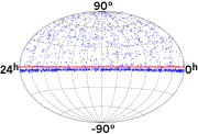 A network of sensors, lowered into deep drill holes (left), detects neutrinos from the Northern Hemisphere that penetrate Earth and exit through Antarctica. The preliminary map of neutrino events (right), plotted on an oval projection of the sky, may show both atmospheric and cosmic sources.Photograph and graphic courtesy of the Amanda Project.