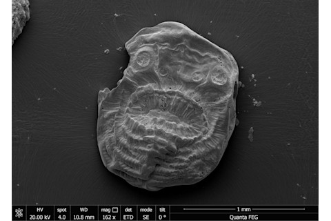 Hey, that's not a Halloween mask run over by a car, that's my ancestor! Viewed with an electron microscope, our tiny, distant ancestor Saccorhytus is no looker. Credit: Jian Han, Northwest University, China.