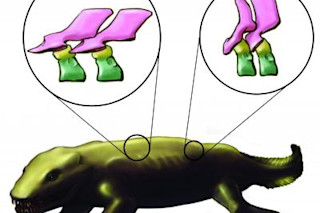 Illustrated version of an Ichthyostega tetrapod, zooming in on the correct orientation of two vetrebrae reconstructed in the study. Credit: Julia Molnar. When the earliest animals hauled themselves out of the ocean and evolved legs, they began flopping and eventually walking down the evolutionary path toward terrestrial life as we know it. The fossil remains of these first four-legged creatures, called tetrapods, have played a crucial role in understanding this sea-to-land transition. The spine is of particular interest, but it turns out that paleontologists had it backward. Tetrapod fossils have long proven difficult to study since the bones often can't be separated from the petrified material that surrounds them. Using a new modeling method, researchers bombarded these 360-million-year-old fossils with high-energy X-rays in order to make 3-D models of the ancient remains. The new method, reported in Nature this week, allowed researchers to isolate the otherwise-hidden bones and see them in their original orientation. The results made paleontologists do a 180. Literally. The previously believed orientation of the backbone was, in fact, backward. Those vertebrae that paleontologists had thought faced forward were actually facing the rear, and vice versa. The skeletons of these first four-legged creatures have long been used to show how the spine evolved. Paleontologists for the last 150 years have therefore theorized about spinal evolution based on an inaccurately pieced-together structure. With the new findings in mind, paleontologists will now need to rewrite the story of early tetrapods and the evolutionary history of the development of other vertebrate species---humans included.
