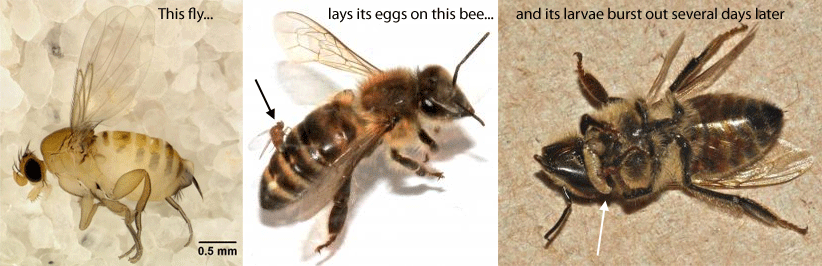 Throughout North America, honeybees are abandoning their hives. The workers are often found dead, some distance away. Meanwhile, the hives are like honeycombed Marie Celestes, with honey and pollen left uneaten, and larvae still trapped in their chambers. There are many possible causes of this “colony collapse disorder” (CCD). These include various viruses, a single-celled parasite called Nosema apis, a dramatically named mite called Varroa destructor, exposure to pesticides, or a combination of all of the above. Any or all of these factors could explain why the bees die, but why do the workers abandon the hive? Andrew Core from San Francisco State University has a possible answer, and a new suspect for CCD. He has shown that a parasitic fly, usually known for attacking bumblebees, also targets honeybees. The fly, Apocephalus borealis,lays up to a dozen eggs in bee workers. Its grubs eventually eat the bees from the inside-out. And the infected workers, for whatever reason, abandon their hives to die. Thereare hundreds of species of Apocephalus flies, and they’re best known for decapitating ants from the inside. The larvae, laid within an ant, migrate to the head and devour the tissue inside. The brainless ant wanders aimlessly for weeks, before the larvae release an enzyme that dissolves the connection between the ant’s head and body. The head falls off, and adult flies emerge from it. A. borealis has a similar modus operandi, but it targets bees not ants. Core discovered its penchant for honeybees by sampling workers that had been stranded in the lights of his faculty building, and other locations throughout the San Francisco Bay area. The fly was everywhere. It was parasitizing bees in three-quarters of the places that Core studied, and its DNA confirmed that the species that attacked honeybees was the same one that kills bumblebees. When Core exposed honeybees to the flies in his lab, he saw the same events that befall unfortunate ants. The flies lay eggs in a bee’s body and weeks later, larvae burst out from behind the insect’s head. It’s no surprise that the infected bees, with up to 13 larvae feasting on their brains, seem a little disoriented. They walk round like zombies, pacing in circles and often unable to stand up. They also abandon their hives. Core found that the dying insects literally head towards the light. Large numbers of them become stranded within bright lights. Many flying insects show a similar attraction, but the stranded bees were stock still rather than buzzing about. They would also head towards lights on cold, rainy nights when other insects seek shelter. It’s not clear why the bees would leave. It could be the fly’s doing, since several parasites can change the behaviour of their hosts. One virus compels caterpillars to climb to high spots where their bodies liquefy, releasing virus particles that rain down on the foliage below. Some fungi steer infected ants towards places with the right conditions for its spore capsules to develop (which erupt from the ants’ heads). Given such manipulations, perhaps the fly changes a bee’s daily rhythms or its sensitivity to light. Alternatively, the bees could flee their hives to avoid infecting their colony-mates. Such altruism is common among social insects – terminally ill ants, which have been infected with a fungus, will often walk off to die alone. None of this means that the fly is the sole cause of CCD. The other viruses and parasites that have been linked to CCD are still important. The fly could even transmit some of them. Core found that many flies tested positive for the Nosema parasite and the “deformed wing virus” (DMV). But certainly, Core’s evidence suggests that the flies are playing some role. Not only do the infected bees behaved in a way consistent with CCD, but the timing also fits. The flies attack the bees most heavily between October and January, and then once more in the late summer. Both peaks happen just before the times of year when CCD is most common in the Bay Area. Core hopes that beekeepers will now help to measure and monitor the spread of the flies. The easiest way is to stick light traps near a hive, and to check the trapped bees for fly larvae. Core himself will try to find out where the flies are attacking the bees, to find ways of stopping them. Similar flies attack honeybees in Central and South America, but North American bees have always seemed to be free of such parasites. That’s no longer the case. Core thinks that A.borealis may be a new threat. After all, honeybees have only recently started to gather around electric lights at night. Honeybees are so economically important that they are very carefully studied. If the flies have been attacking them for decades, we’d probably know about it. Either it has recently expanded its choice of host or it always targeted honeybees at low levels and is now picking up its game. Both scenarios are equally worrying. While bumblebees live in small colonies that die at the end of each year, honeybees live in massive hives that persist throughout the seasons and are often found in close quarters. If A.borealis has gained the ability to parasitise honeybees, its population could explode. That would spell problems not just for honeybees, but for bumblebees and the fly’s other victims. As Core writes, “The domestic honey bee is potentially A. borealis’ ticket to global invasion.” Reference: Core, Runckel, Ivers, Quock, Siapno, DeNault, Brown, Derisi, Smith & Hafernik. 2011. A New Threat to Honey Bees, the Parasitic Phorid Fly Apocephalus borealis. PLoS ONE Citation TBC