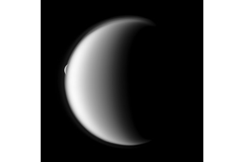I don't have a whole lot to add to this amazing shot from Cassini of Saturn's moon Rhea reappearing from behind the giant moon Titan: