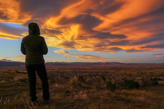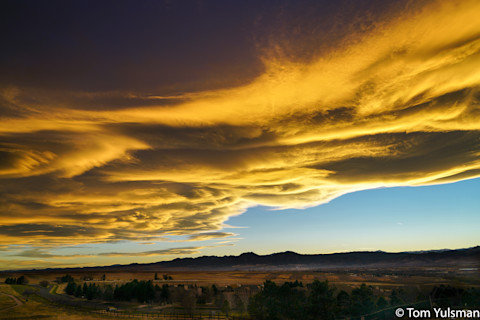 The lenticular cloud formations as they appeared shortly after the Sun had set. Gold colors dominated, with orange, red and even green to follow as the sunset progressed. (Photo: ©Tom Yulsman) Lenticular clouds like these often form when strong winds aloft are forced up and over high mountains. And mind you, ours are particularly high! In the photo at the top of this post, the mountain visible just to the left of my wife and way in the distance is Longs Peak, elevation 14,259 feet.