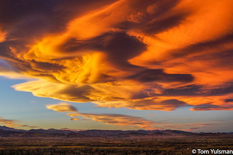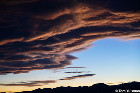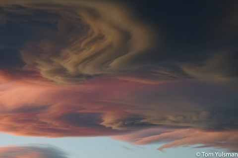 ©Tom Yulsman These patterns occur as turbulent winds in the standing waves sculpt the clouds. Also, there can be multiple oscillations stacked up, one atop the other, creating layering in the cloud formations. Add it all together, throw in the sunset light, and you get what you see in the photos above, as well as the others to follow.