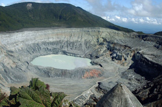 A 2008 image of the summit crater at Poas in Costa Rica. The summit crater lake helps drive some of the phreatic explosions that commonly occur at the volcano - and is one of two summit lakes (the other is cold). Image: Robert Nunnally / Flickr. Ever since the M7.6 earthquake off of Costa Rica earlier this year, we've been watching the volcanoes of the Central American country closely to see if they have any response to the significant seismic event. So far, nothing is conclusive but over the weekend, Poás did have one of its largest explosions in almost 6 years (only a few days after a M6.5 aftershock of the earlier earthquake). News reports from Costa Rica say that the volcano produced a half kilometer (~1500 foot) plume that rained ash on the national park that surrounds the volcano. Now, this is by no means a large volcanic eruption -- it is barely a blip for most volcanoes. However, this is the biggest event at Poás since 2006. Eliecer Duarte, from OVSICORI characterized the eruption was likely a phreatic explosion -- driven by superheated water rather than new magma at the surface -- and the descriptions I've seen would back that up as well. OVSICORI doesn't seem to think this is an event that is leading to something larger, as many phreatic explosions can be, "clearing the throat" of the volcano, so to speak. However, the volcano will remain under close observation to see if the situation changes. Poás erupts frequently but does not tend to have large eruptions - mostly VEI 1 to 2 explosions - at least over the last few thousand years.