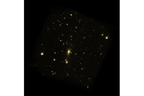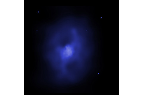 What you're seeing at here is the cluster MS 0735. It's not a cluster of stars, but of entire galaxies! Each object you see there is a galaxy, much like our own. The cluster is something like a couple of million light years across. There are no big galaxies that close to the Milky Way, yet this clusters has dozens, hundreds, in that same volume. It's a crowded place. However, it's not that different than lots of other galaxy clusters we see. Most of them are crowded. This one has a big galaxy right at the center, which is also typical. Heavier galaxies tend to "fall" toward the center, merge, and grow into one monster one. But this cluster hides a secret. And behind that secret is a mystery... When viewed in X-rays, the cluster's secret is revealed: