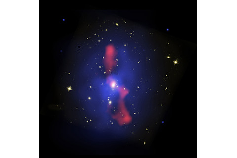 Aha! There you go! In radio, we can see the gas ejected by the black hole, focused into beams (astronomers call them jets) hundreds of thousands of light years long. They're not as hot as the intercluster gas, so they don't emit X-rays, and the gas is too thin to emit visible light. But they glow brightly in radio waves. These beams scream out from the central black hole, moving at nearly the speed of light. Pity any gas that gets in the way... even a trillion solar masses of it. These jets are what carved those cavities into the gas surrounding the cluster. They plowed through all that material, pushing it aside, powered paradoxically by the immense gravity of the black hole deep inside the cluster. This all becomes clear when all three images are put together: