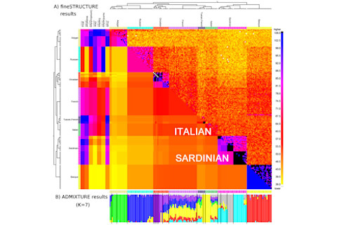 My friend is to the right, and the Uygur woman is to the left. Why the big difference? My friend has an East Asian parent an a European parent. The Uygur woman is the product of a marriage between Uygurs, a population which is due to admixture betwen East Asians and Europeans one to two thousand years ago. Recombination has broken apart the perfect linkage between European and East Asian regions among the Uygurs. Obviously this isn't the case with my friend, as recombination has had no time to generate alternative sequences of ancestry. This is critical information which genome-wide estimates displayed on PCA or ADMIXTURE will miss out on. As for this particular paper and method, I want to point you to figure 5. The darker/bluish colors indicate higher conancestry estimates, and yellower colors lower ones. Red is in the middle. The diagonal tends to be blue/red because that represents populations' correlations with themselves, which one would expect to be high. You can't really read the labels, but I wanted to highlight the Italian and Sardinian blocks. Explanation below.