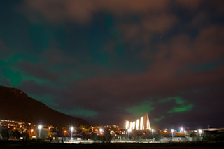 The aurora borealis shimmers above the Arctic Cathedral in Tromsø, Norway on September 12, 2014. (Photo: ©Tom Yulsman) You may have heard about the massive flares and explosions that erupted from the sun this week. These photos show what happened when the blasts hit Earth: spectacular displays of the aurora borealis, or northern lights. I've been traveling in Norway this week, and when I heard about the solar activity and the aurora forecast I borrowed a tripod from a friend here in Tromsø and raced out the door with my wife to take some photos. The images I captured show what happens when Earth's magnetic field is bombarded by material coming from the Sun. The photograph above shows the aurora borealis glimmering above Tromsø's arresting Arctic Cathedral on Friday, September 12, 2014. Light from the city and the moon made the sky a bit bright, which helped to dim some of the detail in the aurora. Moreover, the sky was obscured by some cloudiness — and the clouds were light up by the streetlights below, which explains their somewhat strange coloring.