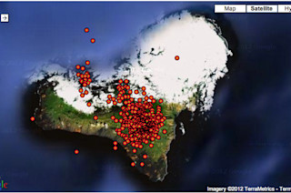 Each red dot represents an earthquake registered at El Hierro in the Canary Islands from September 13-16, 2012. Most are at depths of 18-22 km below the surface of the island. Image: courtesy of AVCAN. A quick weekend note about a volcano we haven't heard from for much of 2012: El Hierro. Seismicity under El Hierro have increased since September 13 after months to very low activity and since Friday, over 300 earthquakes have occurred. These earthquakes are mostly deep (18-22 km) and under the central part of the island (see above), and have now reached over 115 earthquakes in the past 24 hours. This sharp increase at depth might suggest a new body of magma is intruding underneath the island. Combine that with the observation of deformation of the land surface at El Hierro, and you can be fairly confidence that new material is entering. However, as with any observations such as these at an active volcano, the big question is whether this will lead to an eruption and that is very unclear. Intrusion without eruption happen frequently at volcano, so we may only be seeing the normal activity at a hotspot volcano like El Hierro. Only if the seismicity continues and become more shallow, the deformation increases and the release of volcanic gases such as carbon dioxide or sulfur dioxide increase can we begin to wonder if another eruption at El Hierro is in the works. IGN is monitoring the situation at El Hierro, but not decision has been made to increase the alert status at the island volcano (which currently sits at Semaforo Verde, the lowest alert). You can also check out the seismicity by heading to the AVCAN website.