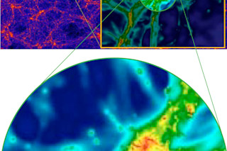 In this simulation, which accompanied the January study, the brighter colors in the upper left image show higher concentrations of dark matter. The inset shows the quasar’s spotlight on the cosmic web, with darker blue representing the lowest density of gas and red representing the highest density.