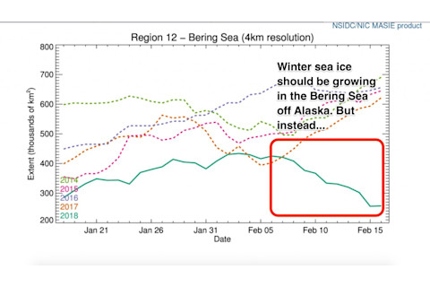 This should not be happening: a dramatic wintertime decline in sea ice in the Bering Sea between Feb. 6-16. Darker blue colors show areas with the lowest sea ice concentrations. One hundred percent ice coverage (and snow as well) is shown in white. Western Alaska is at the bottom, the Aleutians to the left, and Siberia in the upper right. From top to bottom, the scene covers about 600 miles. The animation consists of imagery from NASA's Terra satellite with an overlay of microwave data from the Defense Meteorological Satellite Program. (Images and sea ice data: NASA Worldview. Animation: Tom Yulsman) The Bering Sea off Alaska's west coast has just experienced a shocking loss of ice over a 10-day period — in winter. See the graph below for the details. To my eye it looks like sea ice extent declined from about 420,000 square kilometers on Feb. 6 to about 260,000 square kilometers on the 16th.