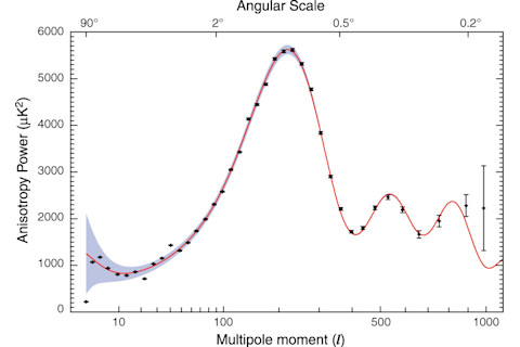 Of course, such fluctuations are generated at every scale; for any particular wavelength, you are supposed to evaluate these quantities at the moment when the mode is stretched to be larger than the Hubble radius during inflation. To date, we are quite sure that we have detected the influence of scalar perturbations; they are responsible for most, if not all, of the temperature fluctuations we observe in the Cosmic Microwave Background. We're still looking for the gravity-wave/tensor perturbations. It may someday be possible to detect them directly as gravitational waves, with an ultra-sensitive dedicated satellite; at the moment, though, that's still pie-in-the-sky (as it were). More optimistically, the stretching caused by the gravity waves can leave a distinctive imprint on the polarization of the CMB -- in particular, in the type of polarization known as the B-modes. These haven't been detected yet, but we're trying. Problem is, even if the tensor modes are there, they are probably quite tiny. Whether or not they are substantial enough to produce observable B-mode polarization in the CMB is a huge question, and one that theorists are presently unable to answer with any confidence. (See papers by Lyth and Knox and Song on some of the difficulties.) It's important to get our theoretical expectations straight, if we're going to encourage observers to spend millions of dollars and years of their time building satellites to go look for the tensor modes. (Which we are.) So Dick and Lev have been trying to figure out what we should expect in a fairly model-independent way, given our meager knowledge of what was going on during inflation. They've come up with a class of models and possible behaviors for the scalar and tensor modes as a function of wavelength, and asked which of them could fit the data as we presently understand it, and then what they would predict for future experiments. And they hit upon something interesting. There is a well-known puzzle in the anisotropies of the CMB: on very large angular scales (small l, in the graph below), the observed anisotropy is much smaller than we expect. The red line is the prediction of the standard cosmology, and the data come from the WMAP satellite. (The gray error bars arise from the fact that there are only a finite number of observations of each mode at large scales, while the predictions are purely statistical -- a phenomenon known as "cosmic variance.")