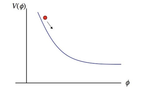 It's hard to tell how seriously we should take that little glitch, especially since it is at one end of what we can observe. But the computers don't care, so when Dick and Leve fit models to the data, the models like to do their best to fit that point. If you have a perfectly flat primordial spectrum, or even one that is tilted but still a straight line, there's not much you can do to fit it. But if you allow some more interesting behavior for the inflaton field, you have a chance. Let's ask ourselves, what would it take for the inflaton to be generating smaller perturbations at earlier times? (Larger wavelengths are produced earlier, as they are the first to get stretched outside the Hubble radius during inflation.) We expect the value of the inflaton potential V to monotonically decrease during inflation, as the scalar field rolls down. So, from the second equation above, the only way to get a smaller scalar amplitude S at early times is to have a substantially larger value of the slope V'. So the inflaton potential might look something like this.