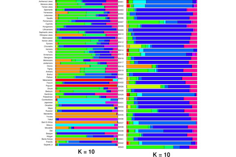 As with the paper I pointed to yesterday it's a little dated. We've come really far since mid-2010! At the top of this post are some ADMIXTURE plots I generated in ~2 hours yesterday. You have K = 10, with ~250,000 markers. On the left are the results for various populations, and on the right are results for individuals who I'm running for their own interest. The identification numbers are small, but you can make some of them out. The first two are ID001 and ID002, my father and mother respectively. I'm going to break the seal of privacy and tell you that regular reader Paul Conroy is ID010. He looks to be...Irish. There are plenty of other regular readers and friends, family, and Latin American significant others of regular readers on that bar plot. You can "out" yourself if you want on this thread. I will tell you that ID042 is an anonymous Tamil Brahmin, while ID043 is Paul G., an ethnic Assyrian from Iran. ID034 is the anonymous Ashkenazi Jew whose genotype I posted earlier. Survey results are fine and good, but the public reception and interpretation of genomics is being created anew right now. I spend some time on the best way to gain some insights from ADMIXTURE and PCA because I don't want to confuse people myself. Most of the reactions have been pretty banal. It turns out that Latin Americans under the presumption that they are "pure Spanish" are not always "pure Spanish." White Americans yearning for Native American ancestry often have their hopes dashed. White Americans who dismissed the family history of a part-Native American grandparent due to the romanticism about aboriginal blood which they perceived around them, turn out to be part-Native American. People do have confusions that need to be cleared up, but it isn't like academics are going to give them that much insight. I know that the above is a working paper, but here's a sentence that crept into that text: "...Hispanics are mestizo more or less by definition...." No, Hispanics are very specifically constructed as a race-neutral term in the USA. Obviously many Hispanics from the Caribbean also don't self-identify as mestizo. Honestly, do the authors know any Hispanics? So what has your experience been with scientific genealogy? I've already talked about my own personal journey at length. I think that race as a concept does have biological utility, but the biggest question mark which I move forward with is how oral history can diverge so rapidly from what our genomes tell us. In particular, the tendency to anchor on slices of privileged ancestry. Looking at it every which way I have confirmed to my satisfaction that my mother does have a small, but detectable, amount of Middle Eastern ancestry from her maternal grandfather as the oral histories and textual records tell us. But this dwarfed by a component she shares with my father which ties them to eastern Asia. But neither are aware of any such connection. These are ancestors forgotten, and makes me reflect on how recollection of memes is not always a remembrance of genes. This may not be as sexy an issue as reification of race through personal genomics, but to some extent that issue is so 20th century. Hundreds of thousands are people are just marching ahead into the future, no matter how "fraught" the results generated by obscure algorithms may seem.