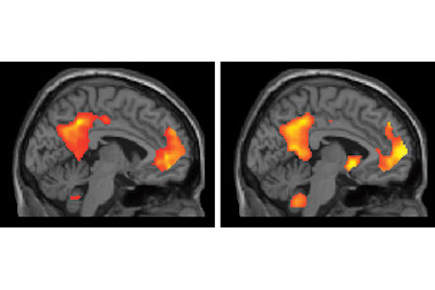 That's what Daniel Schacter at Harvard and his friends have discovered, by doing functional MRI studies of brains subjected to different kinds of cues. (Science Newsreport, Naturereview article, Charlie Rose interview.) Subjects are inserted gently into the giant magnetic field, then asked to either conjure up a memory or imagine a future scenario about some particular cue-word. What you see is that the same sites in the brain light up in both cases. The brain on the left in this image is remembering the past -- on the right, it's concocting an imaginary scenario about the future.