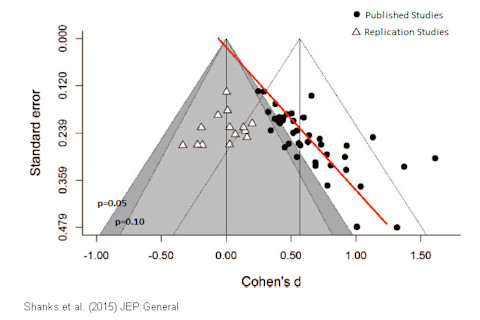 Taken together with the negative results of the eight replication studies that Shanks et al. conducted, the funnel plot suggests that romantic priming doesn't exist, and that the many studies that did report the effect, were wrong. This doesn't mean that the previous romantic priming researchers were consciously trying to deceive by publishing results that they knew were false. In my view, they were probably led astray by their own cognitive biases, helped along by the culture of 'positive results or bust' in science today. This system can produce replicated positive results out of nowhere. I don't think this is a sustainable way of doing research. Reform is needed.