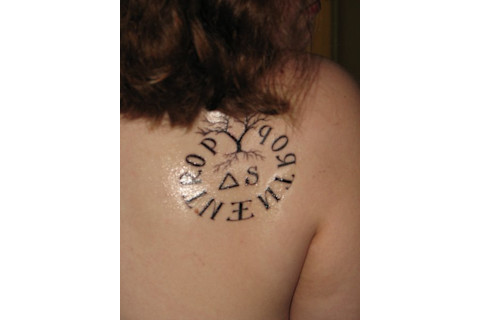 For nearly three years, the story of Abigail Garcia has woven its way through this blog. Back in April 2008, I got an email from Garcia, at the time an 18-year-old student at Reed College. I had started gathering science tattoos, and she had one she wanted to share. "My first year of college, I wanted to be an English major," she wrote, "and I took Intro Chemistry to fill the science requirement. The brief unit on thermodynamics made me fall totally in love. Entropy made sense to me–-scientifically, philosophically. I became a Chemistry major and love every second of it. I got the tattoo to mark my rite of passage--Entropy going both ways, with its symble delta-S in the middle, all supported in the roots of Yggdrasil, the world-tree of Norse mythology (harking back to my English-lit days)."
