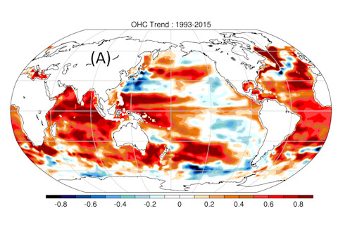 The trend in the amount of heat in the oceans is shown for the period 1993 to 2015. Yellow, orange and red tones show locations where ocean heat has increased. (Source: Lijing Cheng & NCAR. Retrieved from https://climatedataguide.ucar.edu/climate-data/ocean-temperature-analysis-and-heat-content-estimate-institute-atmospheric-physics.) So this morning, as I'm drinking my coffee and perusing news headlines, I see this in the New York Times: "Ocean Warming Is Accelerating Faster Than Thought, New Research Finds." The story was about a new paper published Thursday in the journal Science titled, "How fast are the oceans warming?" This is a big deal, because human-caused global warming doesn't affect just the land surface. In fact, more than 90 percent of global warming's heat is absorbed in the oceans. That has helped prevent much steeper increases in temperature on land. But all that heat going into the oceans isn't really a benign phenomenon. By causing ocean waters to expand, it contributes to sea level rise. The heat also can make storms more destructive, and it's putting enormous stress on ocean ecosystems — which we depend on heavily for food. And in the long run, what goes into the oceans doesn't all stay in the oceans. Heat eventually comes out of the water to contribute to warming atmospheric temperatures around the globe. So knowing exactly how much heat is going in is very important. With that in mind, I checked out other stories about the new paper in Science, and I saw that many featured similar headlines as the N.Y. Times. More about the scientific paper in a minute. But first, I have to say that I realized I had seen very similar headlines before. Just this past October, for example, I saw this in Scientific American: "The Oceans Are Heating Up Faster Than Expected." According to the story, a "new study published yesterday in the journal Nature concluded that the global oceans may be absorbing up to 60 percent more heat since the 1990s than older estimates had found." And nearly two years ago, the Washington Post ran this headline: "The world’s oceans are storing up staggering amounts of heat — and it’s even more than we thought." That was based on a study published in the journal Science Advances. In a press release about it, study co-author Keven Trenberth of the National Center for Atmospheric Research was quoted as saying that "the planet is warming quite a lot more than we thought." Hmmm. Two years ago we already knew that the planet was warming quite a lot more than we thought. So what's up with today's headlines, which seem to suggest that we didn't know this? For quite awhile now, scientists have actually had good reasons to believe the oceans have been taking up more global warming heat than was estimated in a major report in 2014 from the U.N.'s Intergovernmental Panel on Climate Change. And more recently, research has been confirming those suspicions. If you read beyond the headline and down into that New York Times story — which actually is quite good — you'll see that the new paper isn't at all a research article presenting a major new advance. It's actually an assessment based on previous original research of the state of knowledge about rising ocean heat content, or "OHC," as scientists label it. And as the assessment concludes, "Multiple lines of evidence from four independent groups thus now suggest a stronger observed OHC warming." Based on a lot of the coverage I encountered today, you might easily conclude that the new assessment produced dramatic new findings. But the findings have actually been piling up for a few years — as have those headlines, some of them quite dramatic. Now, the authors of the new assessment have pulled multiple strands of previous research together to provide a clearer picture of what's currently known. That picture shows that the oceans are heating up 40 percent faster than what the U.N. report estimated. And things are getting increasingly worse. As Trenberth, one of the authors, put it in an email to me today, "There are clear signs of acceleration." The better estimates of how much global warming heat is going into the oceans is based in part on new ways of piecing together data from different sources. Since the early 2000s, accurate data have been provided by a modern network of floating ocean heat sensors, called the Argo network. But prior to that, information was collected by less accurate sensors called expendable bathythermographs. Because of inaccuracies, the data from the older sensors contained biases. Thanks to recent research, scientists have found ways to deal with this issue, providing a better picture of just how much more heat the oceans have been sopping up compared to the past. The picture has also been improved by new ways of dealing with another vexing issue: In the past, larger portions of the oceans went unmonitored than today. "The oceans are not well observed as we go back in time," notes Trenberth. In the past, scientists tried to deal with this using various strategies for filling the gaps. But these tended to produce overly conservative estimates. More recently, satellite observations and computer modeling have helped improve estimates of what has been going on in largely unmonitored areas of the oceans. And still other researchers have analyzed ocean factors that are influenced by ocean temperature to derive independent estimates of how the ocean's store of heat has changed over time. Overall, the estimates derived by these studies are in line with what climate models have been saying. The models have tended to indicate more ocean warming than what had been observed, and that discrepancy had given fodder for critics of climate change science. But now, Trenberth and his fellow authors say that discrepancy is largely gone. One of the sobering conclusions of the new assessment is the likely consequences of failing to get off the business-as-usual scenario of high emissions of heat-trapping gr