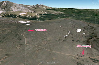Niwot Ridge in the mountains west of Boulder, Colorado, is the site of many ongoing research projects, including the second-longest-running record of atmospheric carbon dioxide. The tundra lab sits at about 11,600 feet. This view of the ridge is looking to the north. (Image: Google Earth) I'm heading up into the mountains until Wednesday morning — on a retreat with a group of fellow science journalists, in part to talk about how we should be adapting to the digital communication revolution. (I'm not sure that this is what we are supposed to be talking about, but it's what I want to talk about!) That revolution is turning out to be as epochal as the one triggered by the invention of the printing press. No surprise here, but it is posing serious challenges to how we do our work as science journalists. To offer one example: How to make a living in an environment in which people have come to expect that all content is free — and, in the age of Twitter, when so many are self-appointed experts with their own printing presses (Wordpress) and television outlets (Youtube). But before we get into that heavy stuff, I'll be leading a few people on a sojourn up Niwot Ridge in the mountains west of Boulder. The image at the top of the post is from Google Earth. This is where where we're headed tomorrow. Our ultimate destination is the Tundra Lab of the University of Colorado's Institute of Arctic and Alpine Research, situated at about 11,600 feet. If you've got a minute at about 12:30 p.m. MDT (2:30 p.m Eastern), check out the steerable Tundracam to see whether you can spot us. Lots of research is being conducted up on the ridge, including a project in which infrared heaters are being used to warm up the alpine tundra to simulate global warming — on a speeded-up timescale of months and years rather than decades. One goal is to see how the composition of species in the alpine tundra might change in a warming climate. Another ongoing project is monitoring of carbon dioxide and other gases in the atmosphere. Niwot Ridge, in fact, has the second longest running record of atmospheric CO2. We'll be stopping tomorrow at the sampling site (which is marked in the image above). Here's the CO2 record from the site:
