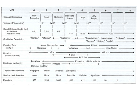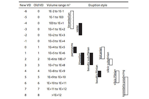 A revised version of the VEI to account for very small but still explosive eruptions, as suggested by Houghton and others (2013). Image: Figure 5 from Houghton and others (2013). Houghton and others (2013) suggest we might need to tweak that VEI scale to account for smaller explosive eruptions. However, we don't want to disrupt the definitions for VEI 1-8, so they suggest we project downward, so the 2008 eruptions at Kilauea would be VEI -2 to -4 (see right): clearly explosive, but small. The use of "gentle" and "effusive" would be jettisoned from the VEI -- after all, it is an explosivity index -- and instead those small strombolian and Hawaiian eruptions that would be lumped into VEI 0 could be discussed with more clarity, which is important for developing volcanic hazard assessments for highly trafficked volcanic vistas like Kilauea or Tongariro. The next challenge would be figuring out how to compare the effusive (lava flow) eruptions with the explosive eruptions, which is more of an apples and oranges issue. However, by adding negative VEI values, we can give those small explosions a little more of their due. * Sidenote: If you do a rough estimate of the total volume over the last 10,000 years of all the VEI 0-1 eruptions (assuming 10,000 m^3 per eruption, which is likely a very loose estimate), the total volume still only adds up to roughly a VEI 2-3 eruption (something like Redoubt's 2009 eruption). References: