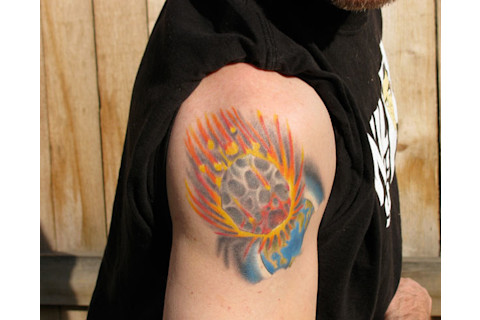 Cool, huh? It's perfect, and just what I wanted! And how appropriate is it to get an asteroid burning up over the Earth? I know, the scale's a bit off, but it's a tattoo, not a scientific graphic in the Astronomical Journal. And I love the flames and the colors. The actual clip never wound up getting aired on TLC, but they did create a fully-produced version and put it up on YouTube - they have a higher res version on the TLC site. For those of you too lazy to click, here is the YouTube video version: