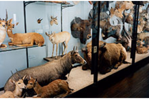Housed in a gabled Victorian mansion, the Walter Rothschild Zoological Museum is divided into sections devoted to marine and terrestrial mammals, birds, insects, fish, crustaceans, and reptiles, but it is often hard to tell where one begins and the other ends. In the ground floor gallery, for example, the turquoise-browed motmot and the iridescent green, feathery-tailed quetzal, both birds from Central America, share a glass-faced wooden cabinet with lions and leopards. In the same crowded room, one case is filled with all forms of pigeons, from the green-winged Southeast Asian emerald dove to the big, blue-black Victoria crowned pigeon from New Guinea. Others house a motley array of primates, including a dusky titi from Brazil, a long-fingered aye-aye from the forests of Madagascar, and a rat-size Southeast Asian slow loris.