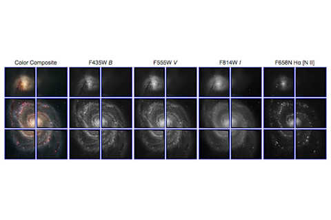 You can see the ACS field of view, and the final version on the left. The different observations are listed (each frame is clickable to embiggen on that page, which lets you explore the galaxy on your own). The filters are labeled on the top of each image: B (blue), V (visual, or really yellow), I (near-infrared), and Hα + [NII], the reddish light given off by hot hydrogen clouds laced with nitrogen. That last bit is where stars are being born, and traces the spiral arms very well. The I-band shows very warm dust as well as stars, so it looks smoother since all that stuff is rather smoothly distributed in the galaxy. The B-band has hot stars in it, so again shows where stars are being born; blue stars don't live very long, and can barely escape their gas cloud nurseries before blowing up as supernovae. When you put these all together you get the majesty of a spiral galaxy, a city of stars much like our own Milky Way. I've seen M51 myself with binoculars and through countless telescopes at star parties, and while it doesn't look as glorious as it does here -- of course -- just knowing what's going on in the galaxy and what it really does look like through the big guns is enough to thrill. It may look blurry and fuzzy through a small telescope, but our brains are big enough to encompass all those light years, and to understand what it is we're seeing. Image Credit: NASA, Hubble Heritage Team, (STScI/AURA), ESA, S. Beckwith (STScI). Additional Processing: Robert Gendler