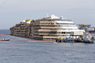 Post-parbuckling, the righted Costa Concordia awaits final decision on where it will be towed and scrapped in mid-2014. | Eidon Photographers/Demotix/CORBIS