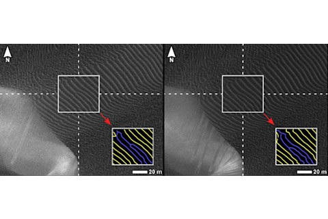 I've said this before, but it bears repeating: when I was a kid, Mars was a dead planet. Dry, frozen, with hardly any atmosphere, I always figured it wasn't very interesting. Heh. Mars may or may not be alive in the biological sense, but it's certainly active geologically! And images from the Mars Reconnaissance Orbiter's HiRISE camera verify it. It's spotted migrating ripples across Martian sand dunes: